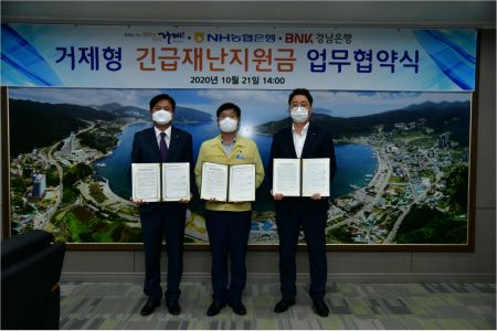 시는 재난지원금 지급을 위해 NH농협은행, BNK경남은행과 업무 협약을 맺었다.