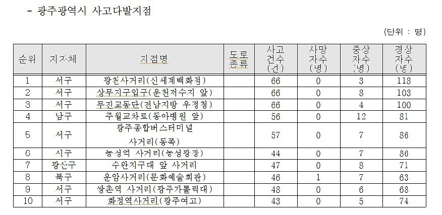 이어 △주월교차로(사고 56건·부상자 93명)△광주종합버스터미널 사거리(사고 57건·부상자 93명)△농성역 사거리(사고 44건·부상자 93명) 등의 순이었다.