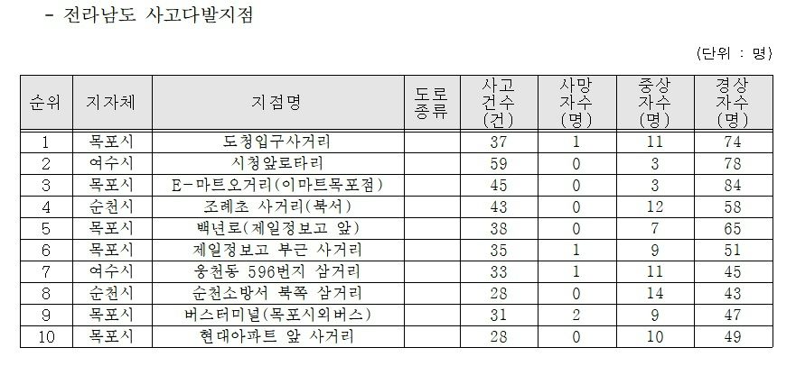 이어 △여수시청 앞 로터리(사고 59건·부상자 81명) △목포 이마트 오거리(사고 45건·부상자 87명) △순천 조례초등학교 사거리(사고 43건·부상자 70명) 순이었다.
