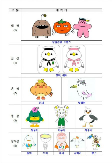 캐릭터 부문 대상은 아귀와 로봇을 합성해 만든 '아로'와 주남저수지의 철새와 단감을 합성해 만든 '감새', 해군모자를 쓴 벚꽃을 의인화한 '버찐' 등 귀여운 캐릭터로 다양한 매력을 발산한 '창원관광 프렌즈(김호영)'가 수상의 영광을 안았다.