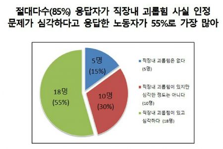 응답자 28명 중 괴롭힘 정도가 심각하다고 대답한 노동자는 18명이며, 괴롭힘 정도는 그다지 심각하지 않다고 대답한 노동자는 10명이었다. 이 중 자신이 직장내 괴롭힘 피해자라고 진술한 노동자도 17명이나 달했다.