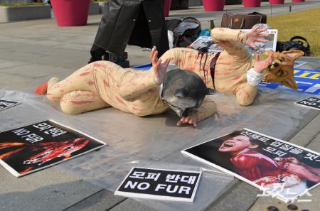 비건세상을위한시민모임이 27일 서울 광화문광장에서 모피·다운 반대 기자회견을 마친 뒤 퍼포먼스를 하고 있다.
