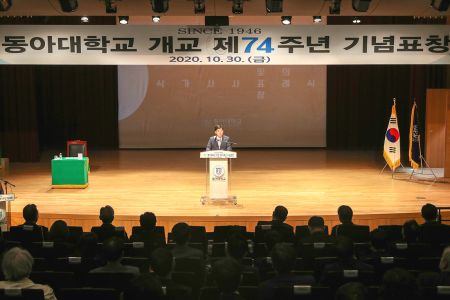 동아대학교(총장 이해우)는 30일 오전 11시 승학캠퍼스 리인홀에서 교직원과 학교법인 관계자, 표창 수상자 등 100여 명이 참석한 가운데 '학교법인 동아학숙 설립 및 동아대학교 개교 74주년 기념식'을 개최했다.