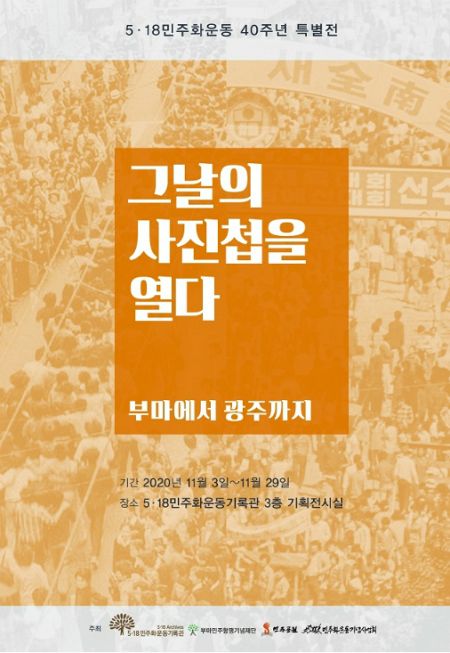 광주시 5·18민주화운동기록관은 부마재단, 부산민주공원, 민주화운동기념사업회 등과 공동으로 3일부터 29일까지 5·18기록관 기획전시실에서 5·18민주화운동 40주년 특별전 '그날의 사진첩을 열다 ; 부마에서 광주까지'를 개최한다.