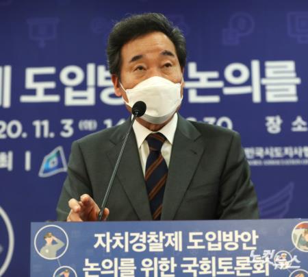 이낙연 더불어민주당 대표가 3일 오후 서울 여의도 국회 의원회관 제2세미나실에서 열린자치경찰제 도입방안 국회토론회에 참석해 참석자들과 기념촬영을 하고 있다. 서영교(앞줄 왼쪽 두번쨰부터) 국회 행정안전위원장, 이낙연 대표, 송하진 대한민국시도지사협의회장, 김창룡 경찰청장.