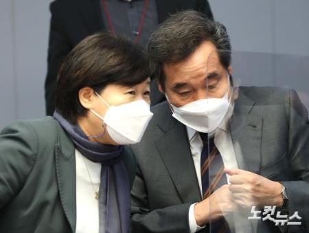 이낙연 더불어민주당 대표가 3일 오후 서울 여의도 국회 의원회관 제2세미나실에서 열린자치경찰제 도입방안 국회토론회에 참석해 서영교 국회 행정안전위원장과 대화하고 있다.