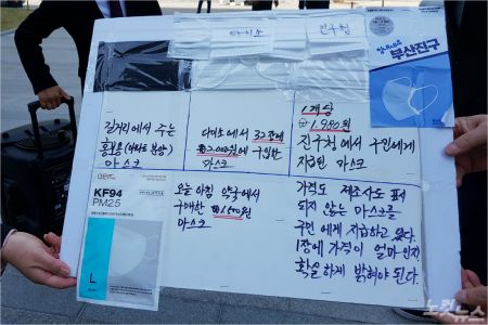 한 주민이 지난 4월 부산진구가 배부한 마스크 품질과 가격에 문제를 제기하는 팻말을 작성한 모습. (사진=박진홍 기자)