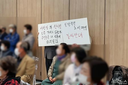 지난달 28일 부산 서구청에서 열린 '완월 선샤인 프로젝트' 공청회에서 도시재생에 반대하는 주민들(사진=박진홍 기자)