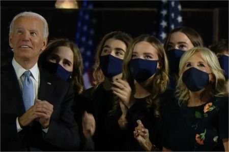 조 바이든 대통령 당선인이 아내 질 바이든(오른쪽 끝) 등 가족들과 함께 승리연설장에서 기쁨을 만끽하고 있다.(사진=ABC캡처)