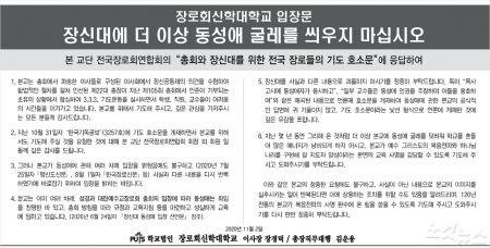 장신대는 입장문에서 지난 달 31일 교단지에 호소문을 낸 전국장로연합회에 대해 사실과 다른 내용을 반복하고 있다면서, 유감을 나타냈다.