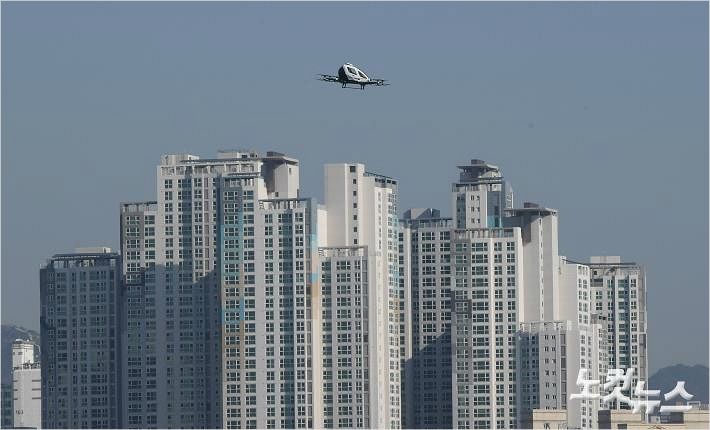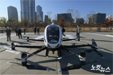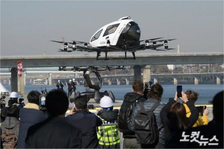 서울시 여의도 상공에 미래 교통수단인 유인용 드론택시가 뜬다. 사람이 탈 수 있는 드론택시 기체가 실제 하늘을 비행하는 것은 국내 최초다.