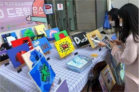 양천구 학교밖청소년지원센터 미술동아리 '드로잉 유스'가 전시한 팝아트 작품을 시민들이 살펴보고 있다. (사진=양천구 제공)