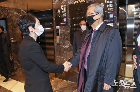 23일 오후 서울 여의도의 한 호텔에서 열린 '부산독립선언' 출판기념회에서 이언주 전 미래통합당 의원(왼쪽)과 국민의힘 김종인 비상대책위원장이 악수하고 있다.