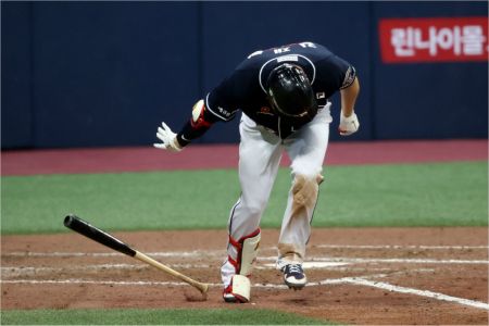 5회초 1사 2루 두산 김재환이 중견수 플라이로 아웃되자 방망이를 던지고 있다. (사진=연합뉴스)