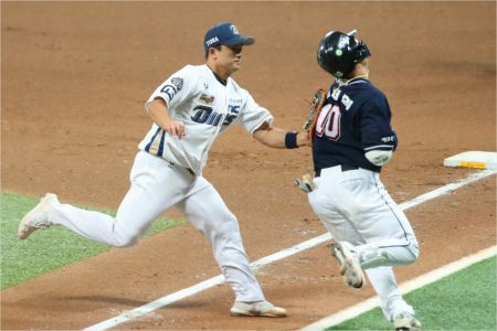 4회초 1사 2,3루 상황에서 두산 박세혁이 땅볼을 친 뒤 NC 강진성에게 태그아웃되고 있다. (사진=연합뉴스)