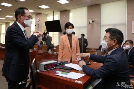 이날 법사위 전체회의는 국민의힘 의원들의 소집 요구로 열렸지만, 이견만 거듭 확인했다. 전날 10여 분만에 산회했던 것과 비슷한 모양새지만 여야의 갈등은 격화됐다.