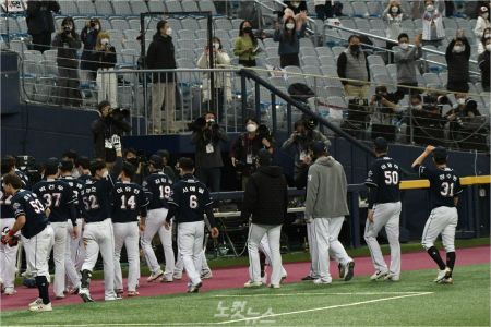 두산 선수들이 지난달 24일 NC와 한국시리즈 6차전에서 지면서 준우승이 확정되자 경기장을 빠져 나가는 모습.(사진=이한형 기자)