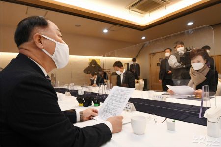 홍남기 경제부총리 겸 기획재정부 장관이 2일 정부서울청사에서 열린 '제11차 부동산시장 점검 관계장관회의'를 주재하고 있다. 홍남기 부총리 맞은편은 김현미 국토교통부 장관(사진=기재부 제공)