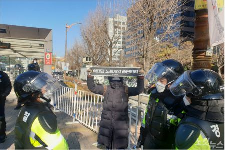 전국민주노동조합총연맹(민주노총)이 4일 서울 여의도 국회 인근에서 1인 시위를 벌이는 가운데, 통행을 막는 경찰과 시위대가 실랑이를 벌이고 있다.(사진=서민선 기자)