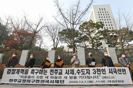 9. 신앙인들과 시민 여러분께 호소합니다. 생태계 말기적 파국의 '리허설'이나 다름없는 코로나 사태의 근원적 해결을 위해서 머리를 맞대야 하는 이때에 검찰개혁이라는 숙원을 놓고 분열하는 것은 옳지 않습니다. 사랑과 정의, "연대와 같은 선은 단번에 영구히 실현되는 것이 아니라 날마다 쟁취해 나가는 것"(회칙 『모든 형제들』 11항)임을 되새기며 실망하지 말고 힘을 모아야 합니다. 어려운 이웃의 겨울을 돌보고 저마다 역량을 다하여 정의와 인권을 회복하는 데 모든 이가 정성을 다하기를 바라며 기도합니다.