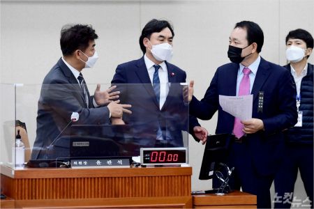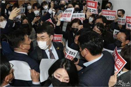 7일 오후 국민의힘 의원들이 더불어민주당의 고위공직자범죄수사처(공수처)법 개정안 등 입법 강행에 맞서 국회 법사위 회의실 앞에 집결해 규탄 구호를 외치는 가운데 민주당 김남국 의원이 국민의힘 의원들 사이를 뚫고 회의장으로 들어가고 있다. 윤창원기자