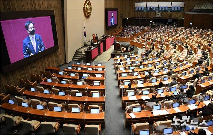 국민의힘 김기현 의원은 9일 저녁 9시쯤 국회 본회의장에서 반대 토론을 시작하며 '대한민국은 민주공화국이다'라는 우리 헌법 1조를 가장 먼저 거론했다.