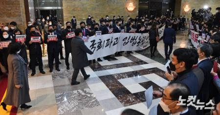 국민의힘 의원들이 10일 오후 국회 본회의장 입구에서 고위공직자범죄수사처 설치 및 운영에 관한 법률 일부개정안 등과 관련해 열린 본회의에 입장하는 여당 의원들을 향해 "위선정권 막장정치 민주당에 경고한다!" 등의 구호를 외치고 있다.