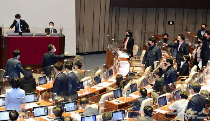 국민의힘은 10일 본회의에서 고위공직자범죄수사처법 개정안을 여당 단독으로 처리한 것을 '독재'라고 비판하며 강력 반발했다. 앞서 법사위에서 안건조정위원회 신청에 이어 전날 필리버스터(무제한 반대토론)까지 진행하며 총력 저지했지만 거대 여당 앞에선 속수무책이었다.