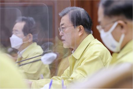 문 대통령은 이날 오후 3시 청와대에서 정세균 국무총리와 각 부처 장관들이 모인 가운데 중대본 회의를 직접 주재하며 코로나19 확산 저지를 위한 범정부 차원의 총력 대응을 지시했다. 문 대통령이 중대본 회의를 주재하는 것은 2월23일 이후 두번째다.