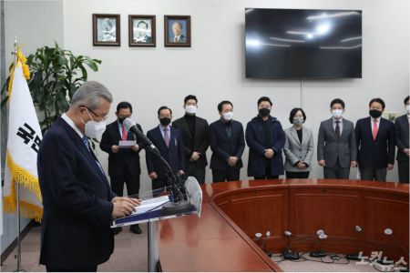 국민의힘 김종인 비대위원장이 15일 오전 국회에서 이명박·박근혜 전 대통령과 관련해 국민에게 사과했다. 국민의힘 계열 당 대표가 두 전직 대통령 문제에 대해 공식적으로 사과하고 고개를 숙이는 것은 처음이다. 김 위원장이 사과문을 읽고 있다. (사진=윤창원 기자)