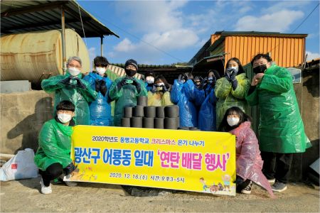 광주 동명고등학교 학생과 교사들이 크리스마스를 앞두고 130만원 상당의 연탄을 광산구 어룡동 배려계층 10세대에게 배달해 주변을 훈훈하게 하고 있다.