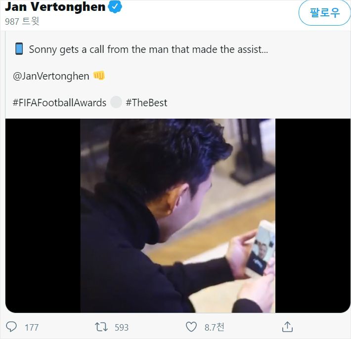 전 토트넘 핫스퍼의 선수이자 손흥민(28)의 푸스카스상 골에 도움을 줬던 얀 베르통언(33·벤피카)이 농담과 함께 손흥민의 수상을 축하했다.