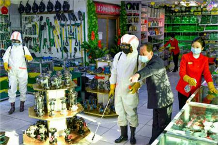 실내 소독작업하는 평양건구기술교류사 종업원들 (사진=연합뉴스)