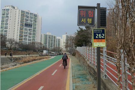 서울 노원구(구청장 오승록)는 관내 당현천 자전거길(3.3km)에 위치를 파악할 수 있는 노면표시와 지주형 번호판을 설치했다고 28일 밝혔다.