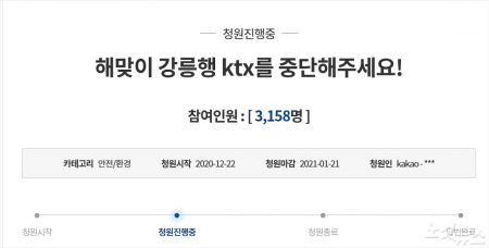 이 같은 걱정과 불안 속에 '해맞이 강릉행 KTX를 중단해달라'는 국민청원도 등장했다. 지난 22일 시작된 청원은 28일 오전 11시 기준 약 3100여 명의 동의를 얻고 있다.