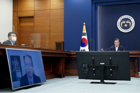 문재인 대통령이 청와대 여민관 영상회의실에서 스테판 반셀 모더나 최고경영자(CEO)와 화상 통화하고 있다. (사진=연합뉴스)