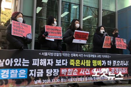 한국여성정치네트워크는 30일 오전 서울 종로구 서울지방경찰청 앞에서 기자회견을 열고 "경찰은 피해자가 고발한 피의사실이 사실인지를 밝힐 수 있는 내용에 대해서는 '공소권 없음'과 '고인과 유가족의 명예'를 근거로 아무것도 밝히지 않은 채 일축했다"며 "피해자의 진술을 공공연하게 부인하는 자들에 대한 불기소 의견 송치만을 밝혀 피해자를 더 극심한 사회적 압박과 2차 가해의 상황으로 내몰았다"고 경찰을 비판했다.