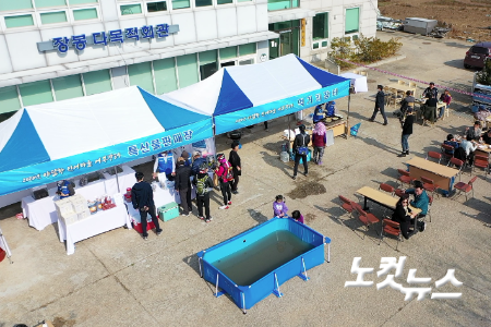 야달항 근처 다목적회관에서 열린 특산물 어부 장터. 노컷TV 영상 캡처