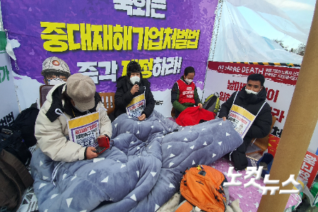 비닐 텐트 안에서 이불을 덮고 있던 김씨는 "솔직히 떡국 한 그릇도 가족들과 먹지 못하고 국회 앞에서 연말과 새해를 보낸 게 끔찍하다"면서도 "올해에는 중대재해기업처벌법이 꼭 제정되어서 기업이 사람 목숨에 경각심을 가졌으면 좋겠다"고 바랐다.