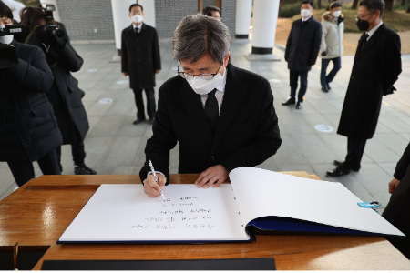앞서 김 대법원장은 이날 오전 국립현충원을 참배했다. 참배 후 방명록에는 "국민들의 애환과 고뇌에 더욱 성심껏 귀를 기울이는 사법부가 되겠습니다"라고 썼다.