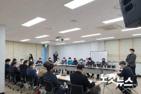 순천 신대지구 주민대표들이 서동용 의원과 간담회를 열고 초고층 오피스텔 추진에 따른 과밀화 우려를 제기하고 있다. 최창민 기자