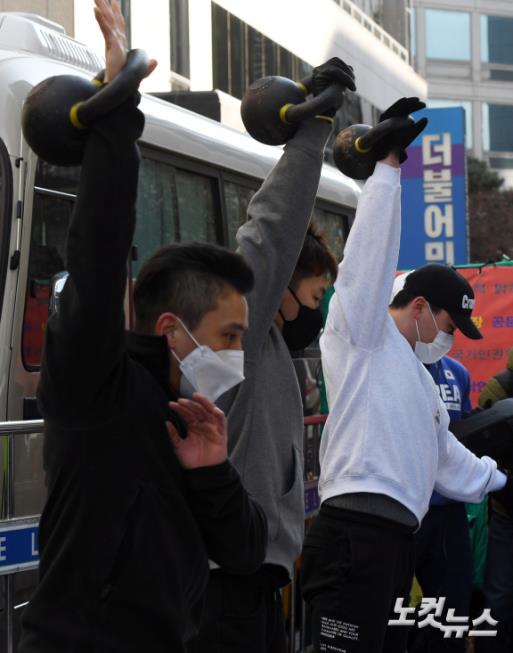 대한민국 기능성 피트니스 협회 관계자들이 5일 오전 서울 여의도 더불어민주당사 앞에서 모든 실내체육시설에 대한 형평성 있는 정책을 촉구하며 크로스핏 퍼포먼스를 선보이고 있다.