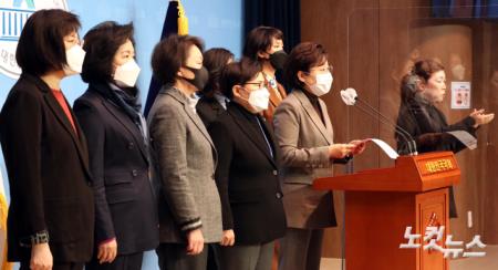 6일 국회 소통관에서 국민의힘 소속 여성의원들이 박원순 전 서울시장에게 성추행 관련 의혹을 전달한 더불어민주당 남인순 의원의 사퇴를 촉구하는 기자회견을 하고있다.