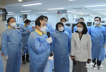 정세균 국무총리가 6일 오후 서울 성동구 코로나19 진단키트 기업인 씨젠 의료재단을 방문해 인사말을 하고 있다.