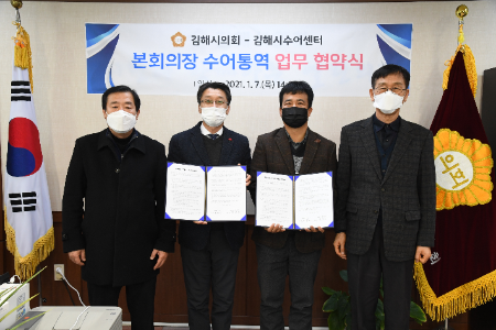 김해시의회는 7일 김해시수어통역센터와 업무협약을 맺고 본회의장에 수어통역사를 배치한다고 밝혔다.