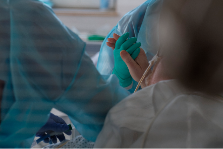 코로나19 환자 손을 잡고 있는 독일 의료진. 연합뉴스