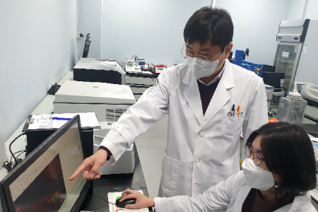 이계주 그룹장과 장유나 연구원(제1저자, 오른쪽)이 단백질 발현을 확인하고 있다. 한국뇌연구원 제공
