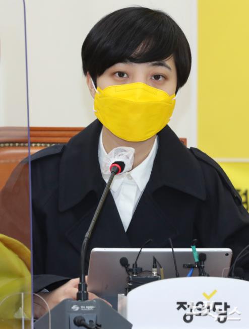 정의당 류호정 의원이 19일 오전 국회에서 열린 의원총회에서 발언하고 있다.