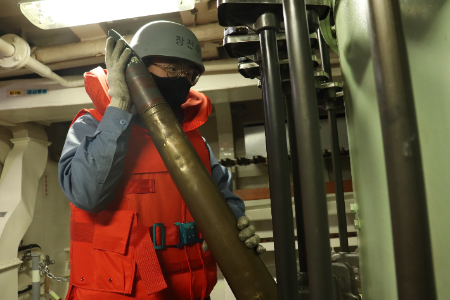 함정에서 임무수행을 위해 포탄 장전 준비를 하고 있는 전윤빈 일병. 해군1함대 제공