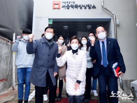 국민의힘 서울시장 보궐선거 예비후보인 나경원 전 의원이 1일 서울 용산구 동자동 서울특별시립 서울역쪽방상담소를 찾아 김갑록 소장 등 관계자들과 기념촬영을 하고 있다.